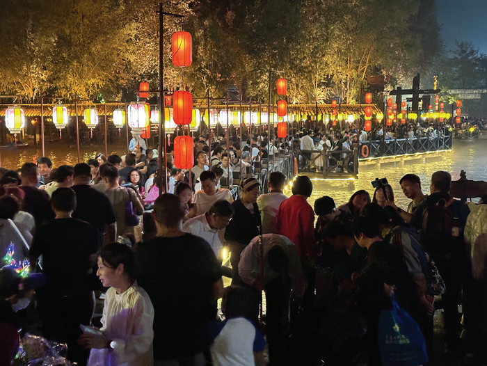 图为 6 月 1 日晚,游客等待观看太行水镇打铁花表演。端午佳节,粽香飘溢,太行水镇化身千年古韵的沉浸式剧场。5月31日至6月2日,太行水镇推出六大主题活动与全天候沉浸式演艺,将传统民俗与现代时尚深度融合,打造了一场穿越千年的文化盛宴。从易水溯源的史诗长河,到北福祈天的倾情演绎;从非遗铁花的璀璨绽放,到燕国风云的侠骨柔情,再到鱼灯盛世的太平欢歌,每一个场景都让人热血沸腾,仿佛置身于波澜壮阔的历史长河之中。活动期间,万人同游、百场演出、千种玩法,让游客穿越古今,感受到“白昼市井烟火,星夜光影传奇”的极致体验。