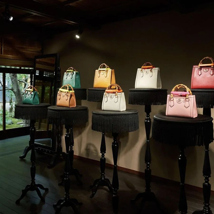 在这座拥有近百年历史、融合东西方风格的建筑里,GUCCI 展出了以全新风貌示人的经典竹节包 DIANA 手袋,此外还有来自 GUCCI 档案馆的 1950 —1990 年代的古董竹节包。