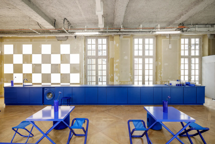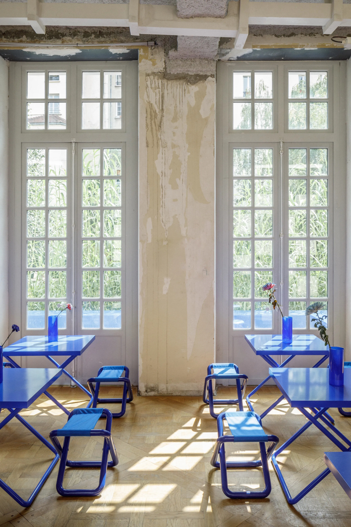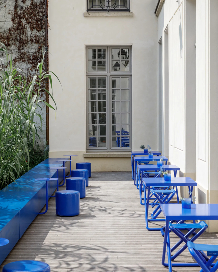 店铺整体以Crosby Studios 设计工作室主打的全蓝色家具为主视觉设计,当太阳出来时,宁静的庭院露台和外摆座位,可俯瞰Rosiers – Joseph Migneret 花园。店内售卖咖啡、烘焙甜点等轻餐食品。