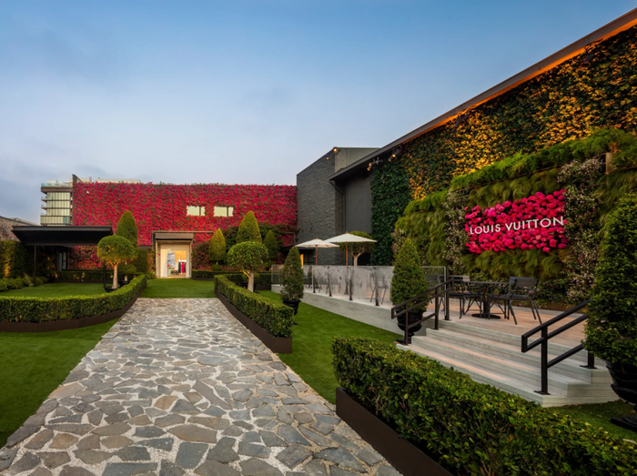 LV洛杉矶快闪店为邀请制,仅对受邀VIP开放。店铺入口处是郁郁葱葱、修剪整齐的别墅花园,整体装饰风格极具法国里维埃拉风格。