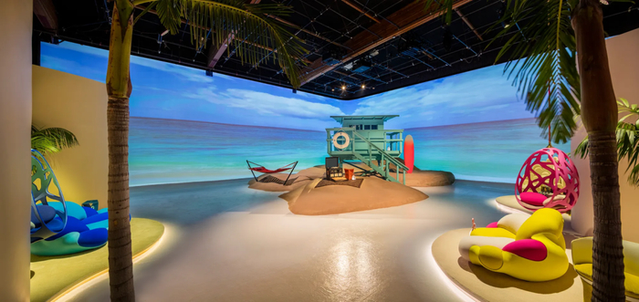 店铺内部分为三个不同主题空间,拥有视觉景观阳台的“巴黎豪华公寓”、LV位于塞纳河畔的Asnières-sur-Seine工坊以及马布里阳光海滩。