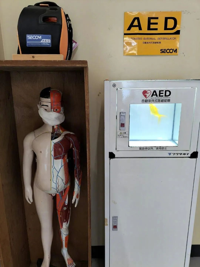 再往里走,你会发现AED心脏除颤器、旧式投影仪都变成了展示鱼类的窗口。