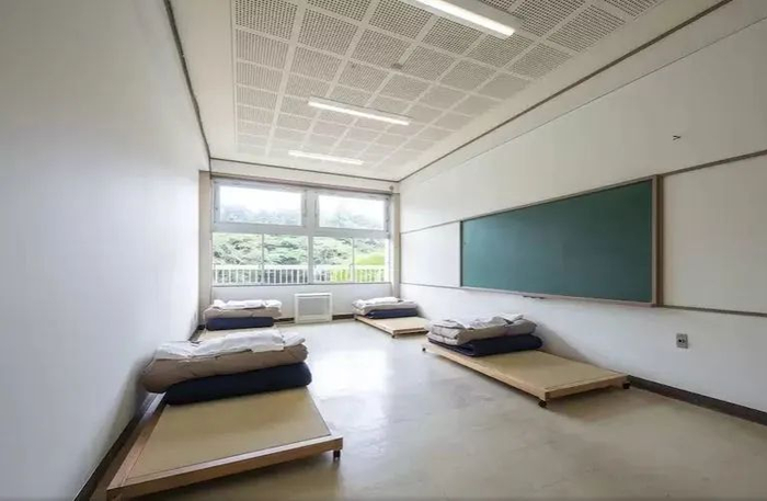 每一间带有标号的教室都是一间卧房,多人宿舍以及单人空间的设计让合住或者是短暂休息,在这里都可以满足。更为重要的是,大家终于可以感受一次在讲台黑板下面睡觉的“青春期叛逆”了。