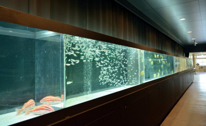 进入教学楼,沿着走廊,寻常水族馆的气息扑面而来。在灯光下,各类不同的小型鱼展遍布走廊。