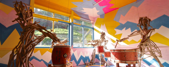 礼堂里,木条制作的彩色人偶都系上了钢索,连接到校舍外的水池,随着室外水压改变,室内的人偶也会相应动起来,看上去像是孩子们在课间活动。