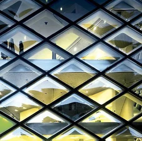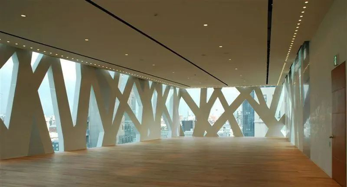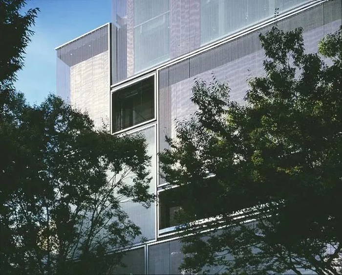同样是为了模糊建筑层数以及垂直水平的正交楼板,伊东丰雄采用的策略为——将树的剪影演化为表皮,和表参道上的行道树呼应,从而形成了标志性符号。