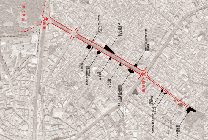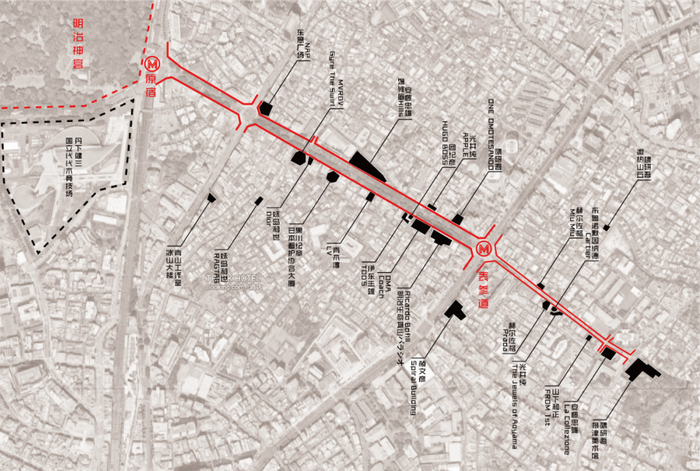 表参道建筑一览 © 建道筑格OCtect我们现在所提的广义的「表参道」,一般是指“表参道地铁站—表参道道路—原宿站—明治神宫”全长约1.1公里的区域,以及沿线周边的商业部分。