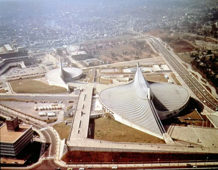 1960年代的日本正处于新工业化阶段,“城市环境飞速变化,建筑如何与之适应?”是丹下健三所研究的重要课题。丹下健三提出“都市轴”高速环状交通网的城市设计概念,并将场馆位置锁定在其中一个重要节点之上——原宿站旁的华盛顿高地旧址。