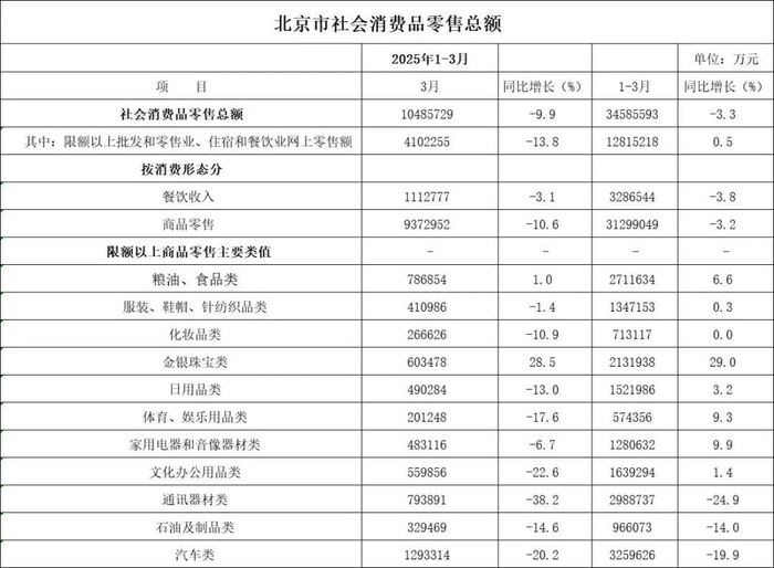 2025年一季度北京社零增速下滑3.3%,而上海下滑1.1%。下滑速度3月份尤甚,北京下滑9.9%,上海更是达到14%的降幅。北京个别品类如通信器材、汽车等下降幅度高达19-25%。