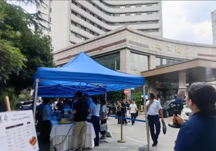 近日,杭州之江饭店外摆餐饮引发热议,其打着“之江外摆,吉食已到”的宣传语每天下午15:30-18:00支起外摆摊,售卖饭店的菜品,其中卤鸭和糯米糍可以试吃,扎肉10元/块、卤鸭38元/半只、芸豆猪蹄32元/份、红卤肥肠28元/份、大肉包3元/只、话梅沼虾38元/份……据媒体报道,之江饭店第一天外摆的营业收入就有6500元。
