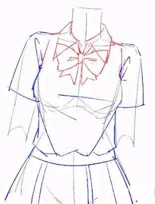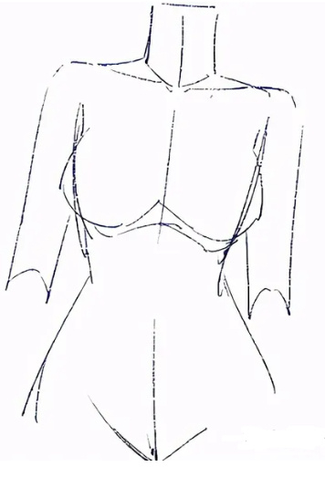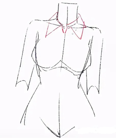 然后画线不是说一定要画脸,一定要全部连在一起,不需要的你有这个趋势就可以了。这种趋势就可以。然后我们中间可以再画一下,然后你要加扣子换,到时候通过上色加也可以。大概的整体的上衣的部分,我就给大家画了一下。
