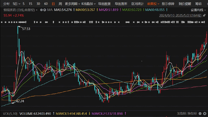 截至5月21日收盘,A股股价报55.94元/股,年内累计涨幅达22%,总市值突破3568亿元,动态市盈率(TTM)攀升至52倍。