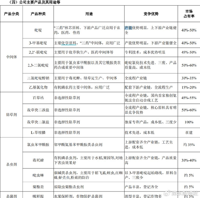 红太阳自主研发的吡啶碱合成技术打破国外垄断,拥有超500件专利,其中发明专利占比超80%。其“中间体-原药-制剂”全产业链布局,使生产成本较同行低15%-20%。公司凭借全产业链优势,在吡啶碱市场中占据领先地位。