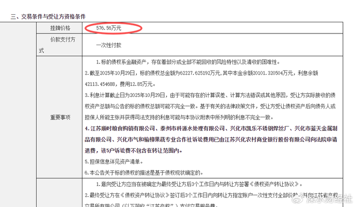 而这个资产包的挂牌价格仅为576.56万元,不足债权总额的1%。