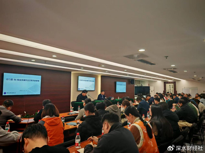 2025年12月12日下午,苏豪弘业联合国家税务总局江宁经济技术开发区税务局开展“出口退(免)税业务操作及日常风险管理”专题税务宣讲活动,业务单位、财务部门等80余人参加活动。本次培训由国家税务总局江宁经济技术开发区税务局税源管理二科副科长吕立科主讲,系统阐述了出口业务全流程中的关键风险防控点,重点强调客户资信调查、产品敏感性与合规性、单证备案规范、收付汇管理以及备案变更等重要环节的操作要点与法律责任,并结合《出口企业风险防范相关规定》内容,对异常凭证处理、退(免)税方法变更、印花税缴纳、研发费用加计扣除资格判定等常见疑难问题进行了清晰解读。培训引入了《2025典型案例》中的真实骗税案件,通过剖析“离奇业务增长”“高危商品出口”等典型案例,生动揭示了骗税行为的特征,提出了防范的化解的具体措施。本次活动以合作遵从、税企共治为引领,通过税务政策与典型案例宣贯,聚焦精准服务、风险共防、协同共赢,切实增强了业务与财务一线人员的风险辨识及防控能力,为苏豪弘业出口业务的平稳运行与长远发展奠定了坚实的合规基础。