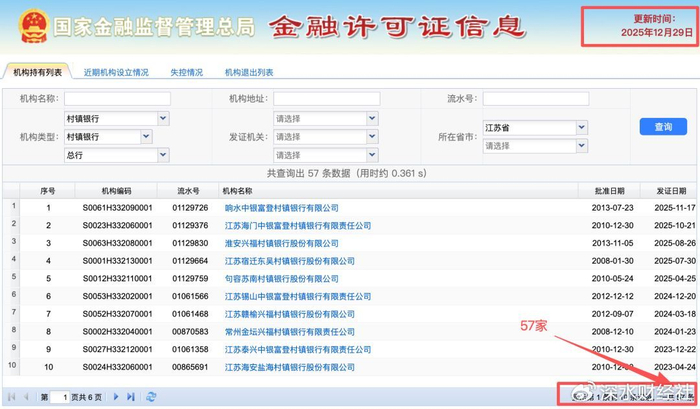 随着张家港行“第一单”村改支的落地,江苏村镇银行的整合或将进入加速期。据统计,截至2025年末,江苏省村镇银行还有57家。