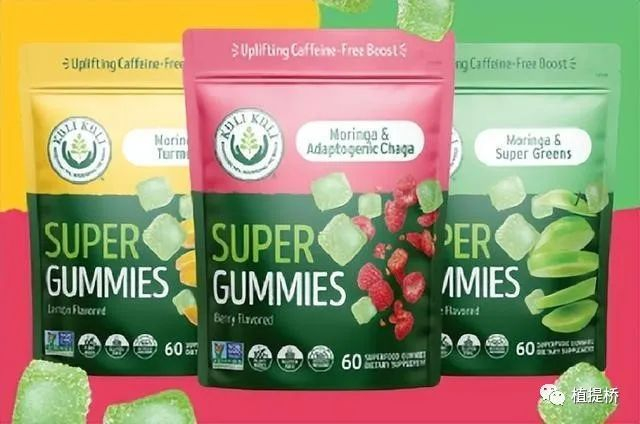 Kuli Kuli是一家以辣木植物为主的北美原料供应商。其辣木软糖不含明胶,三种口味可供选择,包括青苹果(浆果、辣木和白桦茸)、辣木(柠檬、辣木和姜黄)和超级绿叶蔬菜(小麦草、螺旋藻、欧芹、小球藻和羽衣甘蓝)。其中两款都添加了辣木成分。虽然我国对辣木的认知度比较低,但是国际市场对辣木的发展前景看好。从2018年至2022年间,国际知名品牌公司如Zija和Kuli Kuli都是美国以辣木为主要原材料生产公司,产品包括辣木粉、辣木棒、零食、补充剂等,其产品在亚马逊(Amazon)、Costco 等多家零售店有售。