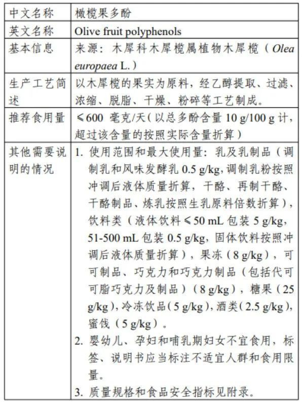 橄榄果多酚在美国被作为“一般认为安全的物质(GRAS)”管理。推荐食用量为≤600 毫克/天(以总多酚含量10.0 g/100g计,超过该含量的按照实际含量折算)。