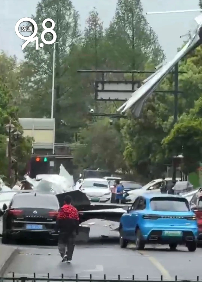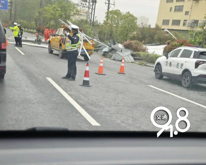 今天下午2点左右,冯先生(化名)开车经过萧山区联东路与里士湖路交叉口附近,看到有广告牌倒塌,“现场情况比较严重,是一个很大的广告牌,砸在地面之后摔得粉碎。现场有交警、环卫等工作人员在场,这条路一共4条车道,因为这一突发情况,有3条车道被临时管控。”