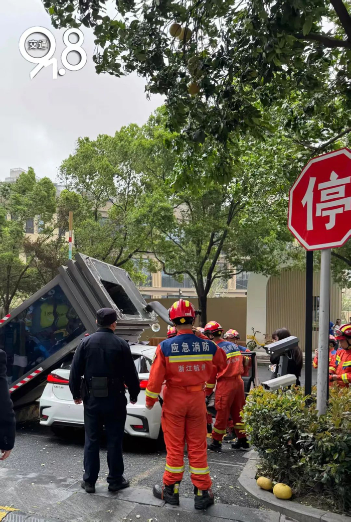 “好家伙!杭州这风怎么回事?保安亭倒了,压在了车上……”