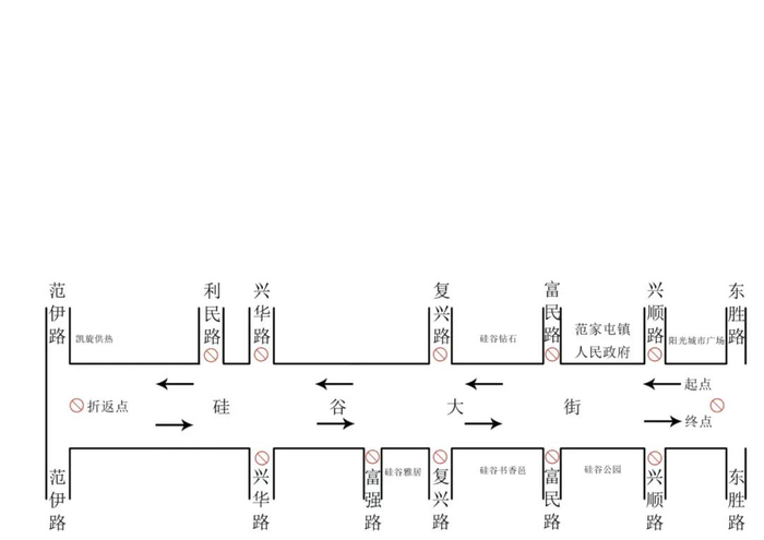 硅谷大街与东胜路交会(阳光城市广场门前起点)-兴顺路-富民路-硅谷雅居-兴华路-平洋社区-清真寺-凯旋供热(折返)-硅谷大街与东胜路交会(硅谷大街阳光城市广场门前终点)。