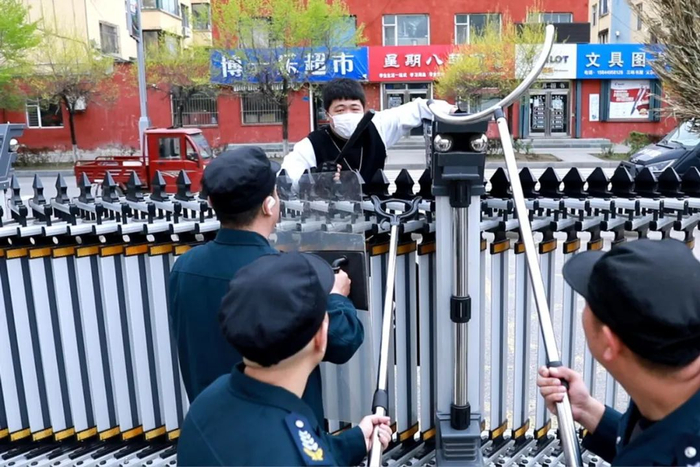 模拟演练中,以校园内突发暴力事件为场景,2名“歹徒”手持凶器强行闯入校园,企图对师生实施暴力行为。学校安保人员发现险情后,立即按下校园一键报警装置,向公安机关报警,并迅速通知值班领导启动校园防暴应急预案,其余安保人员手持钢叉、盾牌等防暴器械组成最小作战单位,将其控制在一定范围内,防止其进一步靠近师生。同时,接到警情的民警快速赶到现场,与学校安保人员协作配合,成功将“歹徒”制服并带离。