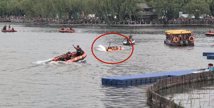 上午9时39分许,两只龙舟敲鼓出发展开角逐。但刚开始,围观的人群中即传来呼声,有游客称一艘龙舟翻船了,“刚开始,就结束了。”
