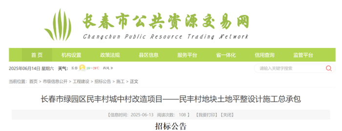 6月13日,长春市公共资源交易网发布《长春市绿园区民丰村城中村改造项目——民丰村地块土地平整设计施工总承包》招标公告。重点内容如下: