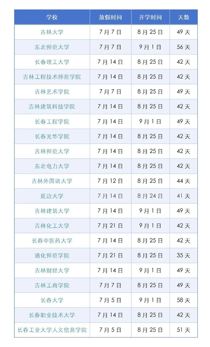 长春市义务教育学校7月11日结束课程,暑假从7月12日开始,8月31日结束;普通高中学校7月18日结束课程,暑假从7月19日开始,8月31日结束。全市中小学9月1日开学。教职工提前一周上班。