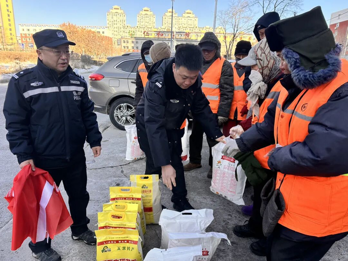 活动现场,民警们将一袋袋沉甸甸的大米和面粉递到每一位环卫工人手中,与这些“城市美容师”拉家常、问冷暖。“张大姐,今年冬天扫雪任务重,辛苦了!一定要注意保暖和安全。”“李师傅,最近身体怎么样?清晨作业千万要穿亮眼的反光服。”一句句朴实而真挚的问候,源自日常巡逻中对这些熟悉身影的观察与记挂。他们深知,干净整洁的辖区环境,离不开这些“环卫橙”起早贪黑的默默付出。