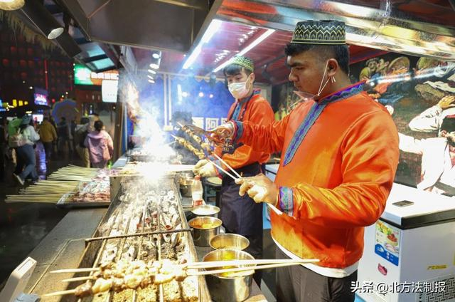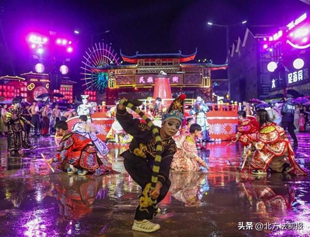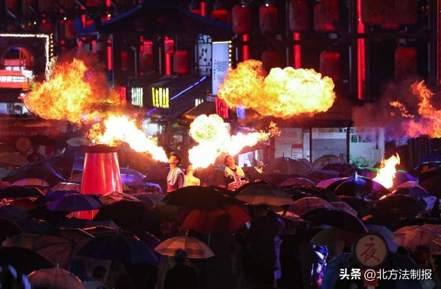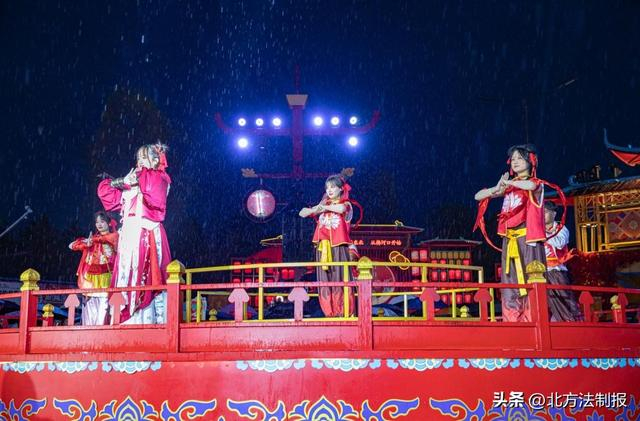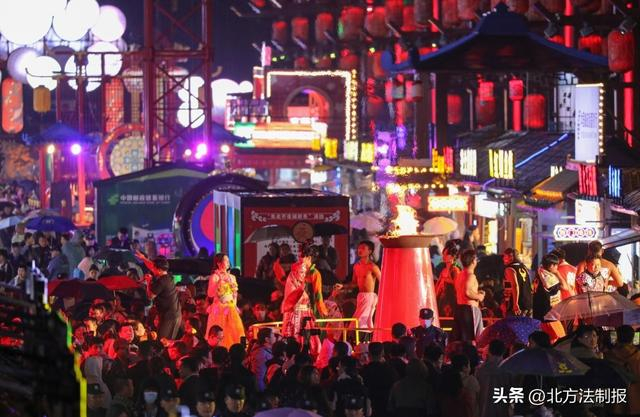 当晚18时30分,“中华战舞”开启炸街巡游,鼓点铿锵、槌影翻转,完成了一场跨越山海的南北对话。19时许,《万邦来朝》主题大秀华服闪耀,异域风情表演、外国使节进贡、妃子献舞、君王敬酒,千年丝路文明在现代夜游街区揭开神秘面纱。