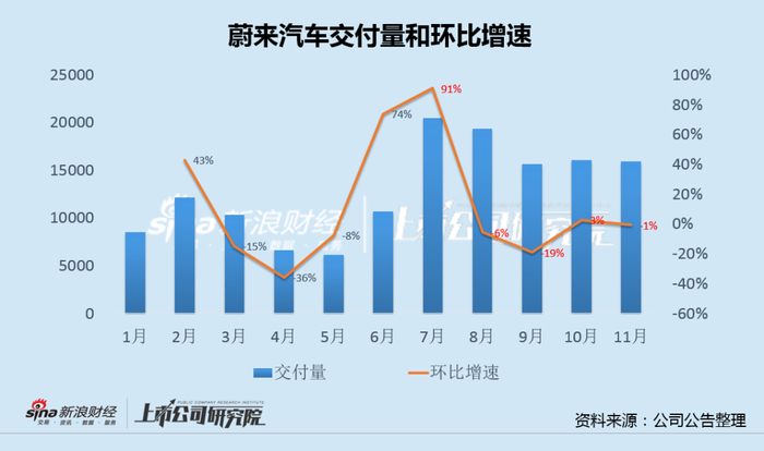 数据显示,8月起,蔚来月销量开始震荡下滑,9月到11月则一直维持在1.5万-1.6万辆区间。