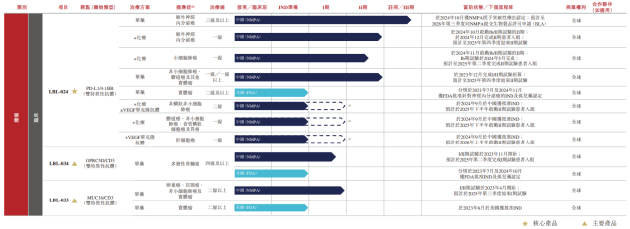 14款候选药物中,6款已进入临床阶段。其中,核心产品LBL-024是一款处于注册临床阶段的PD-L1与4-1BB双特异性抗体,该候选药物已于2024年7月进入针对肺外神经内分泌癌的单臂关键性临床试验。其余三款主要产品LBL-034、LBL-033、LBL-007分别处于临床Ⅰ期、临床Ⅰ期、临床Ⅱ期。