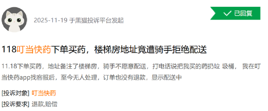 2025年11月,有消费者投诉称,在叮当快药下单后,因地址是楼梯房竟遭到骑手拒绝配送,骑手甚至声称要将其购买的药品“扔垃圾桶”。最终该订单无人处理,款项也未退还。