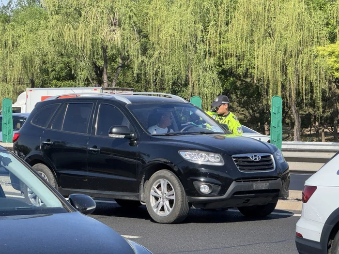 早上8点多,京承高速出京方向临近京承收费站区域路段车行缓慢,一辆黑色现代越野车违法走应急车道,看到交警后连续向道路内侧变更三条车道,在收费站处被交警拦停进行教育处罚。