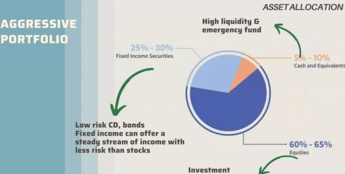 那么另外对于激进型的投资组合我们会建议60%-65%放到equity当中,equity投资就是:我们投资的像房地产、crypto、stock market等等这些会存在一些风险,但同时也会有更高收益期待的这种投资类别。