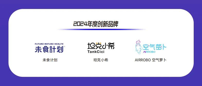 该奖项聚焦品牌创新力,以2024年品牌年度产品创新力、用户口碑度、渠道销售度评选,评出本年度最佳创新品牌。今年获得2024年度“创新品牌”奖项的有未食计划、坦克小希和AIRROBO空气萝卜三个品牌。