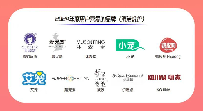 在宠物清洁洗护领域,荣获2024年度“用户喜爱的品牌(清洁洗护)”的获奖品牌有雪貂留香、爱犬岛、沐森堂、小宠、嬉皮狗 Hipidog、艾宠、超宠爱、波波、伊珊娜和KOJIMA。