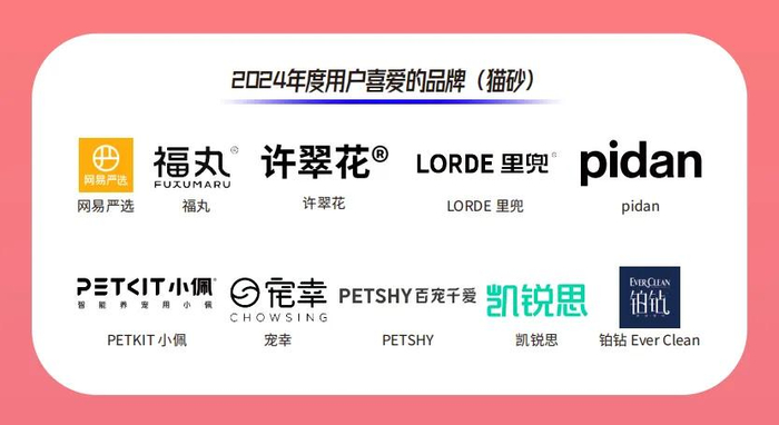 猫砂领域,荣获2024年度“用户喜爱的品牌(猫砂)”的获奖品牌有网易严选、福丸、许翠花、LORDE里兜、pidan、PETKIT小佩 、宠幸、PETSHY、凯锐思、Ever Clean铂钻。