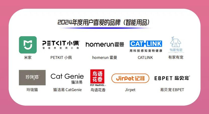 米家、PETKIT小佩、homerun霍曼、CATLINK、有家有宠、玲珑猫、猫洁易 CatGenie、鸟语花香、Jirpet、易贝宠 EBPET获得了2024年度“用户喜爱的品牌(智能用品)”奖项。
