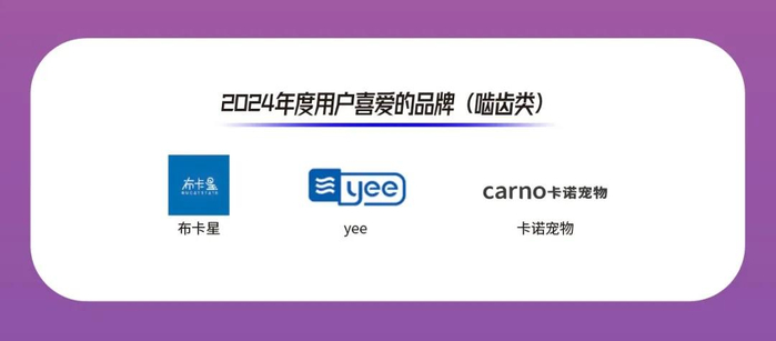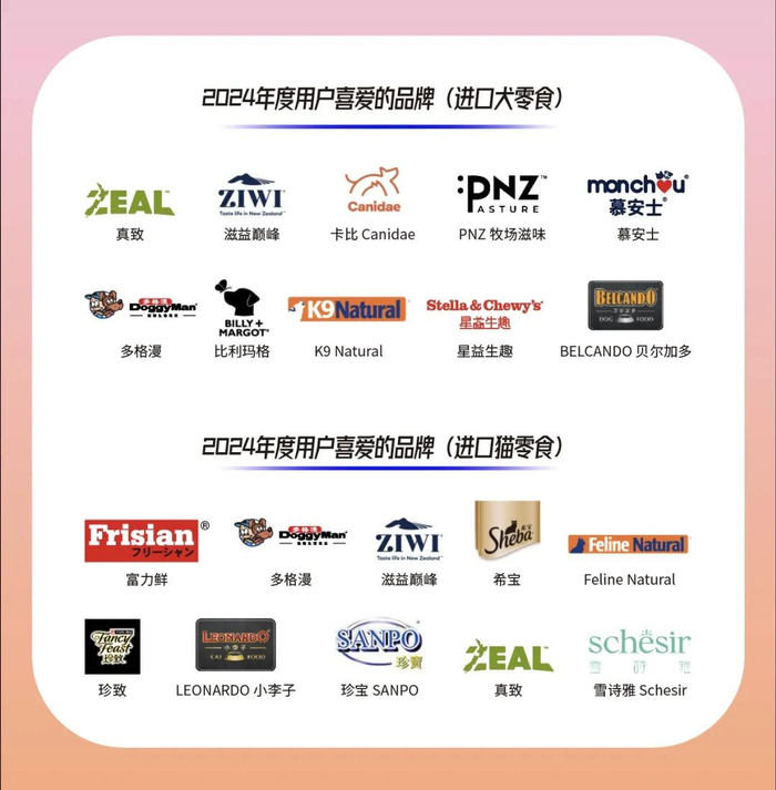 卡比 Canidae、PNZ牧场滋味、慕安士、比利玛格、K9 Natural、星益生趣、BELCANDO贝尔加多则更受犬主人的喜爱,获得2024年度“用户喜爱的品牌(进口犬零食)”奖项;富力鲜、希宝、Feline Natural、珍致、 LEONARDO小李子、珍宝SANPO、雪诗雅Schesir更受猫主人的喜爱,荣获2024年度“用户喜爱的品牌(进口猫零食)”奖项。