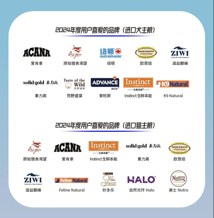 爱肯拿、原始猎食渴望、素力高、欧恩焙、滋益巅峰、Instinct生鲜本能获得了2024年度“用户喜爱的品牌(进口犬主粮)”及“用户喜爱的品牌(进口猫主粮)”两个奖项。