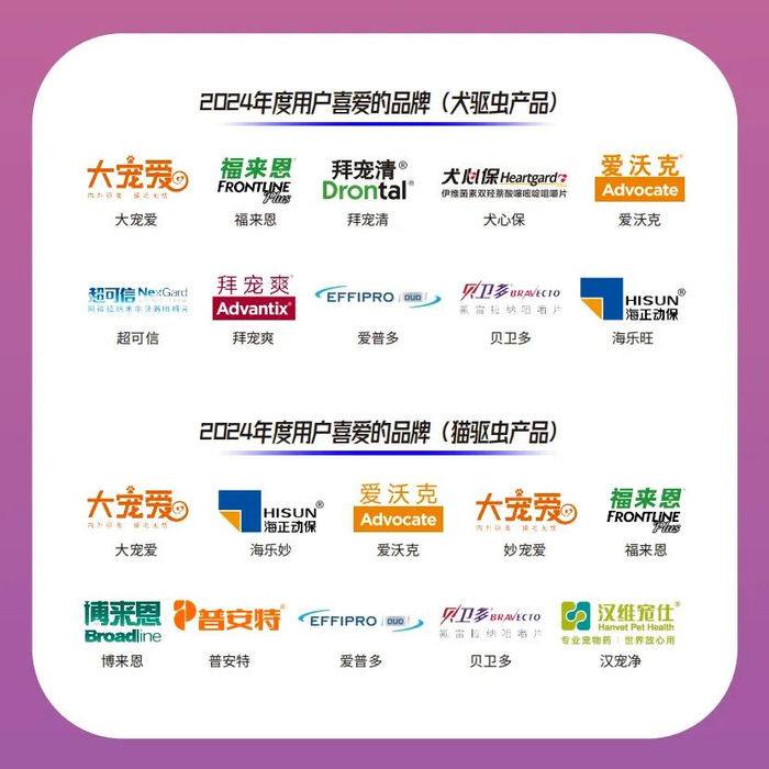 拜宠清、犬心保、超可信、拜宠爽、海乐旺则更受犬主人的喜爱,荣获2024年度“用户喜爱的品牌(犬驱虫产品)”奖项;而海乐妙、妙宠爱、博来恩、普安特、汉宠净则拿下2024年度“用户喜爱的品牌(猫驱虫产品)”奖项。