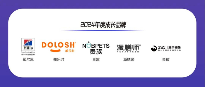 该奖项聚焦品牌成长,以2024年相较2023年的整体业绩成长、品牌成长、用户口碑度成长、产品力成长为标准,评选出本年度成长品牌。荣获2024年度“成长品牌”奖项的是希尔思、都乐时、贵族、派膳师、金故五个品牌。