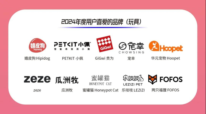 在2024年度用户喜爱的宠物玩具品牌中,嬉皮狗Hipidog、PETKIT小佩、GiGwi贵为 、宠幸、华元宠物 Hoopet、zeze、瓜洲牧、蜜罐猫 Honeypot Cat、乐吱吱 LEZIZI、两只福狸 FOFOS荣获该奖项。