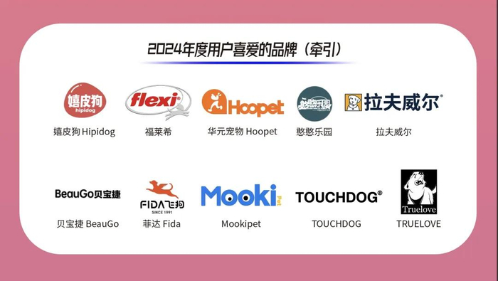 嬉皮狗 Hipidog、福莱希 、华元宠物Hoopet、憨憨乐园、拉夫威尔、贝宝捷BeauGo、菲达Fida、Mookipet、TOUCHDOG、TRUELOVE斩获2024年度“用户喜爱的宠物牵引品牌”。