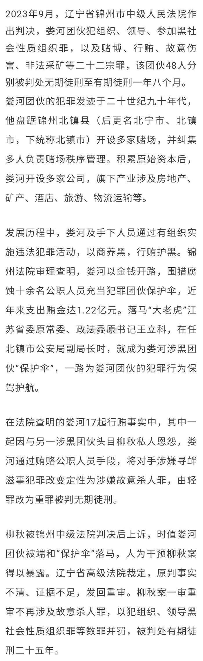 锦州法院审理查明,娄河以金钱开路,围猎腐蚀十余名公职人员充当犯罪团伙保护伞,近年来支出贿金达1.22亿元。