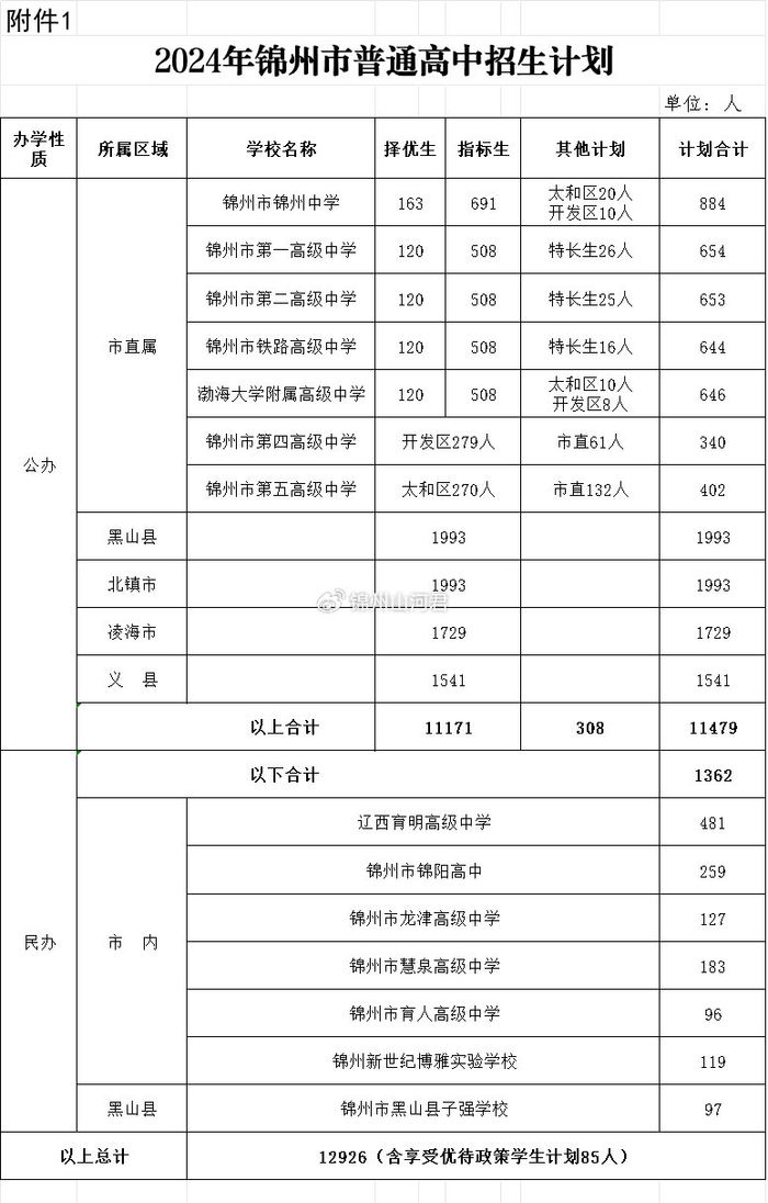 1.2024年锦州市普通高中招生计划