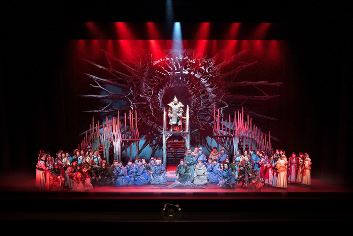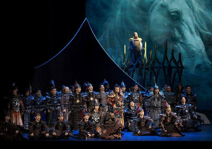 歌剧《江格尔》三幕三场,江格尔与本巴百姓悼念洪格尔。韩蓬 饰 江格尔,摄影:粟国光