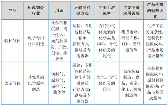 公司是处于化学原料和化学制品制造业(C26)的专业从事气体的研发、生产、销售和服务一体化解决方案的环保集约型气体综合供应商。公司目前已建立品类丰富、布局合理、配送可靠的气体供应和服务网络,能够为客户提供特种气体、大宗气体和天然气三大类100多个气体品种。